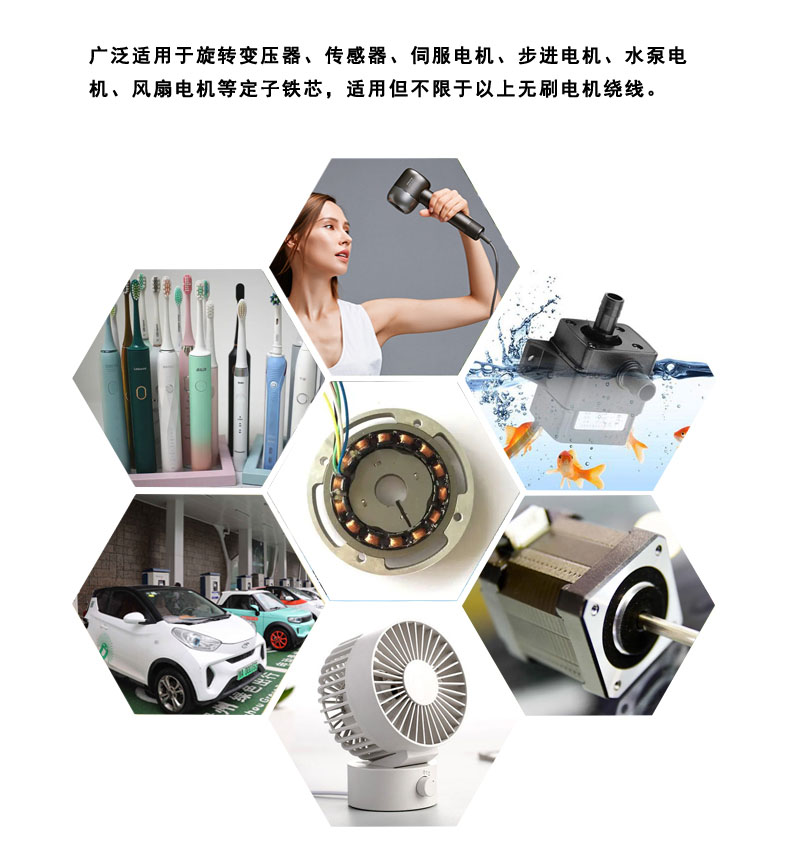 家用電器電機、醫療器械電機、工業風扇、水泵、新能源汽車、旋轉變壓器、傳感器、伺服電機、步進電機水泵電機、吸塵器電機、電動工具類電機等定子鐵芯,適用各類無刷電機繞制。