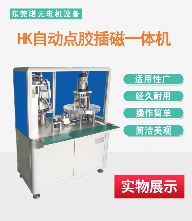 ◆ 點膠和插磁一體,先點膠,再插磁 ◆ 可同時插入多片磁鐵,帶磁不帶磁可通用 ◆ 簡便易學,只需放入產品至模具上再按下啟動按鈕即可 ◆ 運動部分采用無桿氣缸、導軌、直線軸承等,經久耐用 ◆ 機架采用鋁型材與烤漆鈑金組成,簡潔美觀