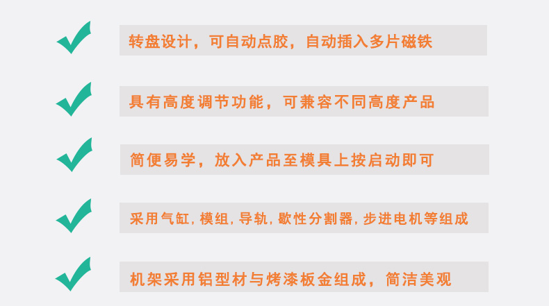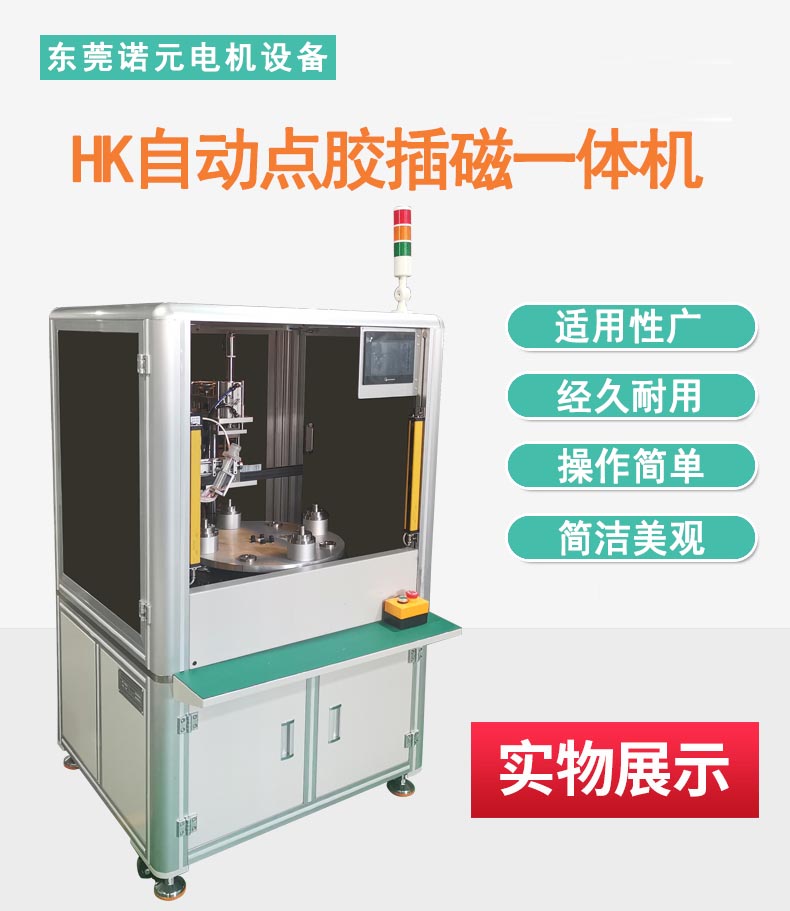 ◆ 轉盤式設計,自動點膠,自動插磁 ◆ 簡便易學,只需放入產品至模具上再按下啟動按鈕即可 ◆ 運動部分采用氣缸、導軌、直線軸承等,經久耐用 ◆ 機架采用鋁型材與烤漆鈑金組成,簡潔美觀